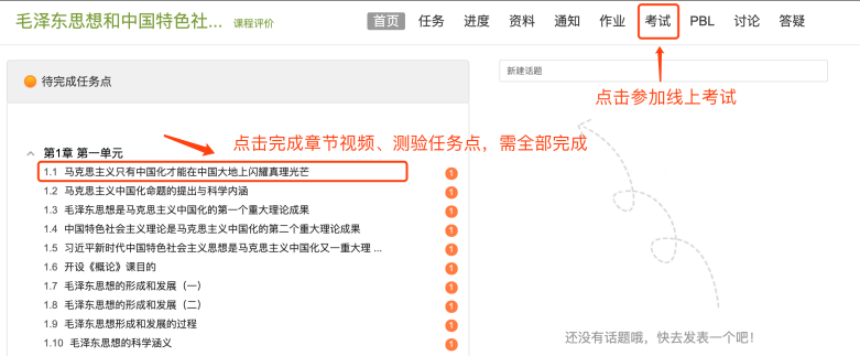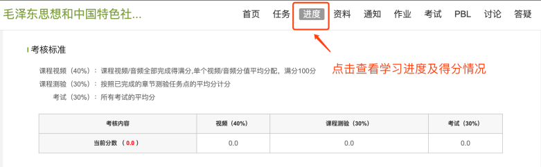 3.学习章节任务点、完成线上考试 4.查看学习进度及综合得分