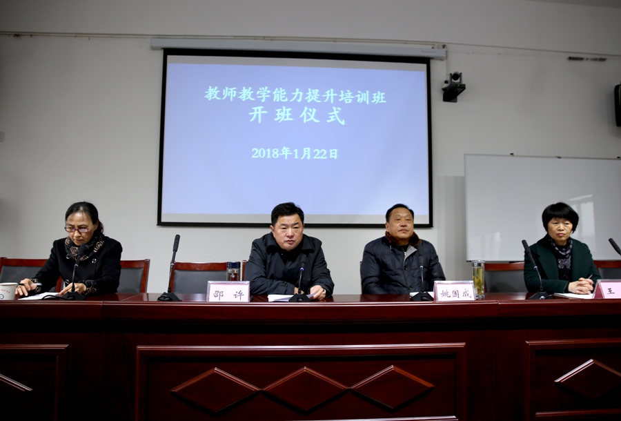 为了更好地促进年轻教师的专业成长,使其尽快熟悉业务,形成教育教学能力,有效提高教育教学质量,结合我校实际状况, 1月22日,学院组织第一期青年教师教学能力提升集中培训,为期4天。学院党委书记邵许、院长姚国成、副院长刘淑凤、教务处处长王青参加了开班仪式。仪式由刘淑凤主持。